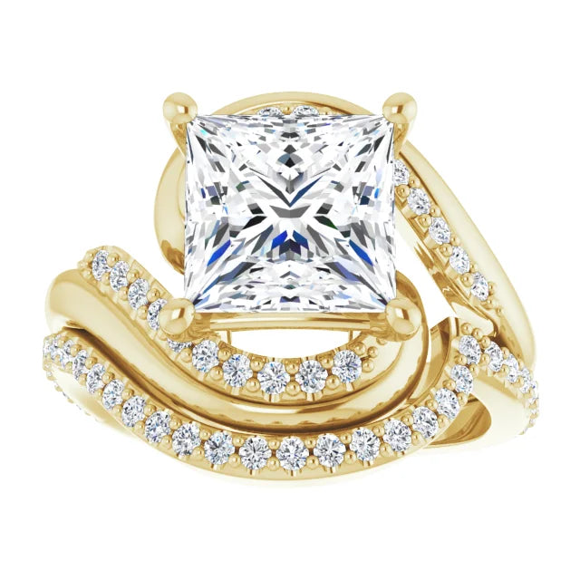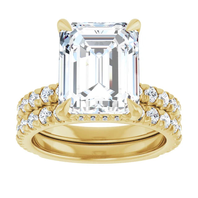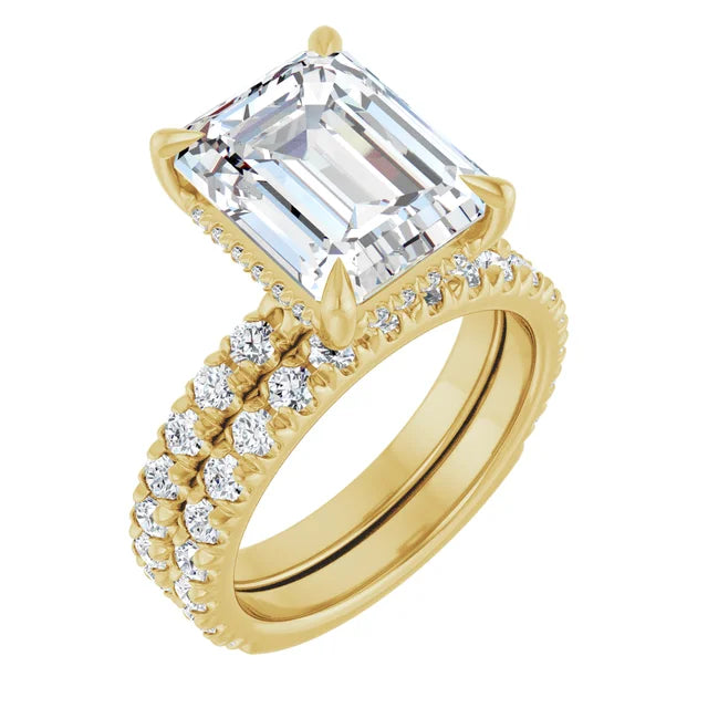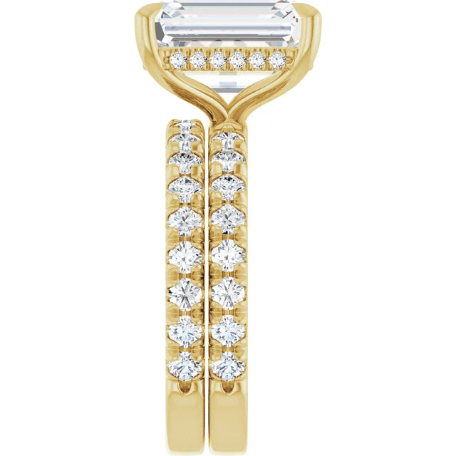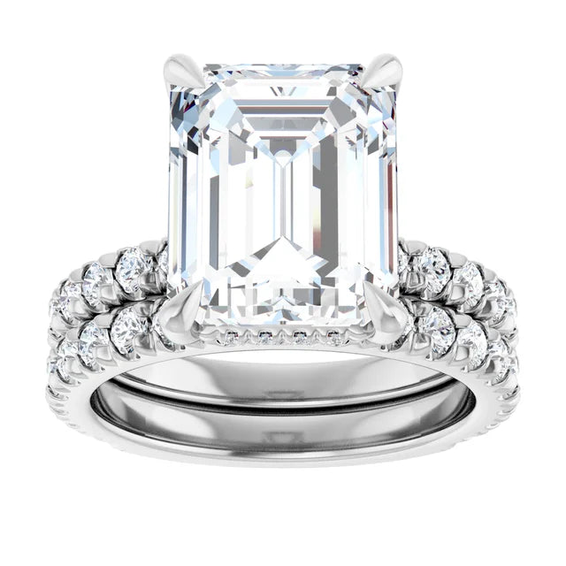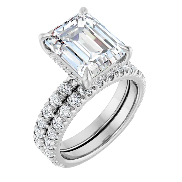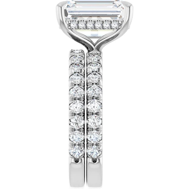 Crafted for a romance that feels larger than life, this emerald-cut moissanite ring set is nothing short of unforgettable. With every glance, the center stone tells a story of your love.