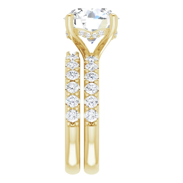 An elevated expression of elegance and radiance, this lab-grown round brilliant diamond engagement ring set is masterfully crafted to captivate from every angle. The centerpiece features a certified round brilliant lab diamond, secured in a classic four-prong setting that maximizes light return and brilliance.