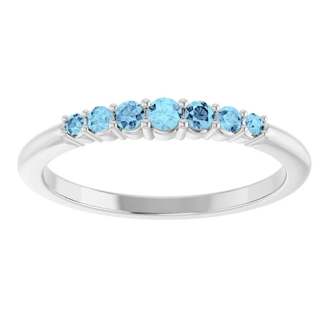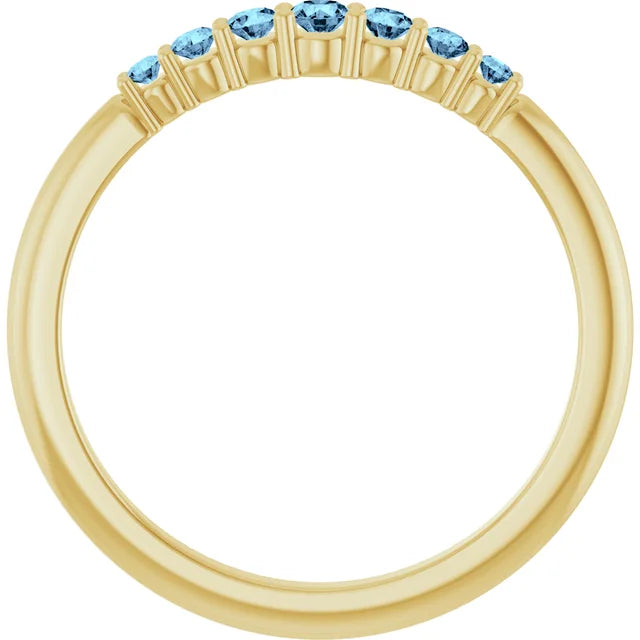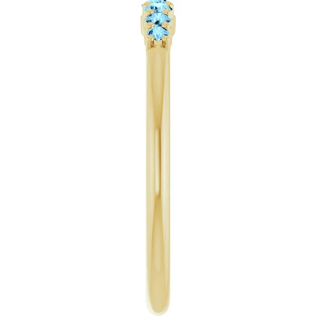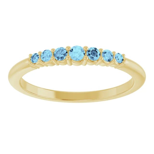 Delicate, elegant, and endlessly versatile, this round-cut aquamarine stackable band is the perfect addition to your jewelry collection. Featuring a row of shimmering natural aquamarine gemstones set in 14K solid gold, this ring adds a subtle pop of color and sophistication. Wear it alone for a minimalist look or stack it with your favorite bands for a personalized style.