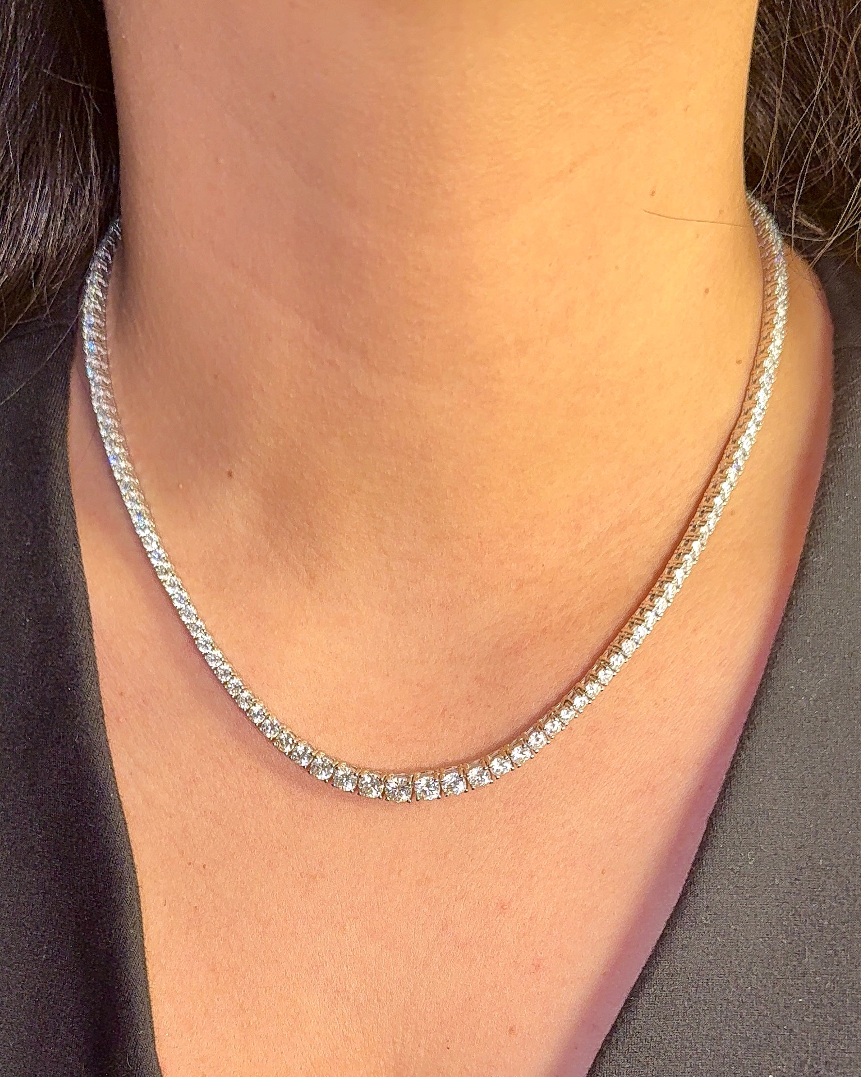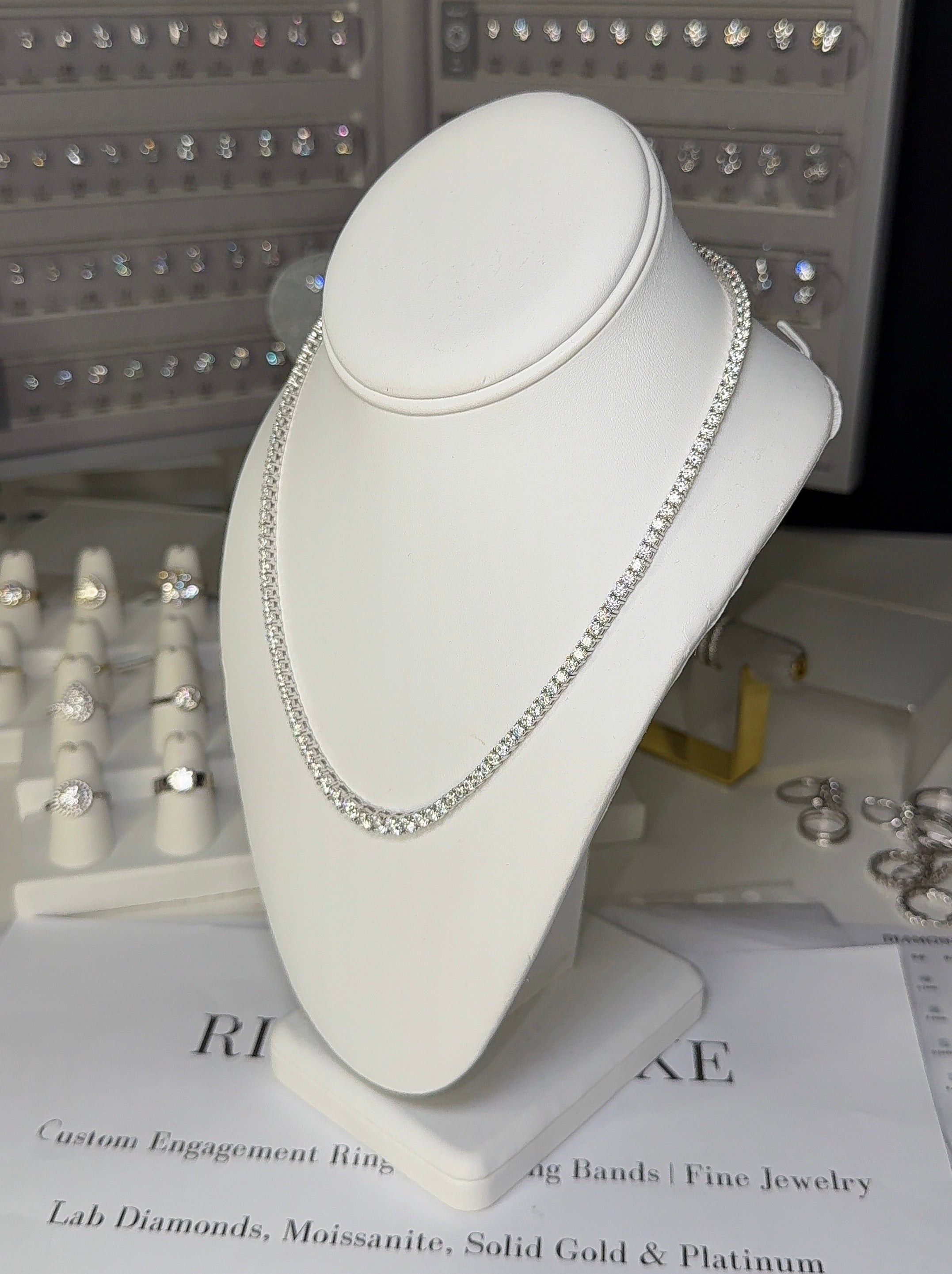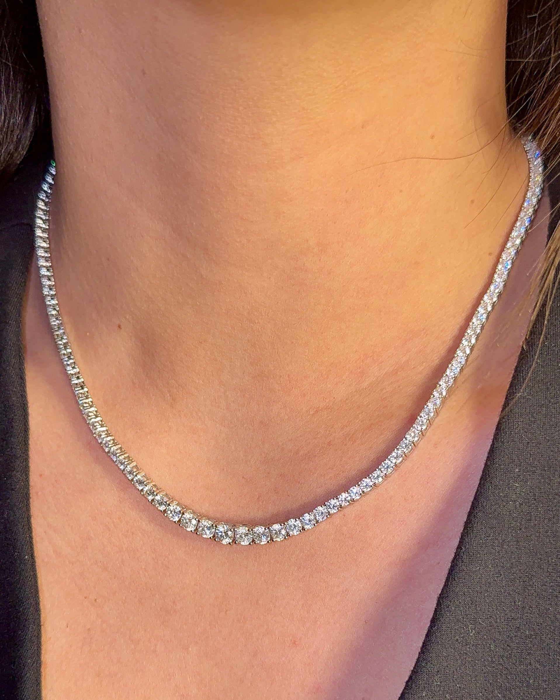 Our new, timeless ascending tennis necklace is a must have this holiday season. This timeless piece showcases a continuous row of brilliant moissanite diamonds, each meticulously set to enhance their exceptional sparkle and fire.