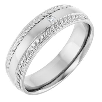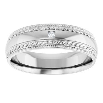 This sophisticated men’s band combines timeless elegance with unique craftsmanship. Crafted in 18K Gold, the band features a single, brilliant princess-cut diamond at its center, offering a subtle yet captivating sparkle. The design is accented with intricate rope detailing and delicate milgrain edges, adding texture and depth to the polished gold surface.