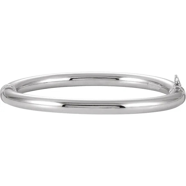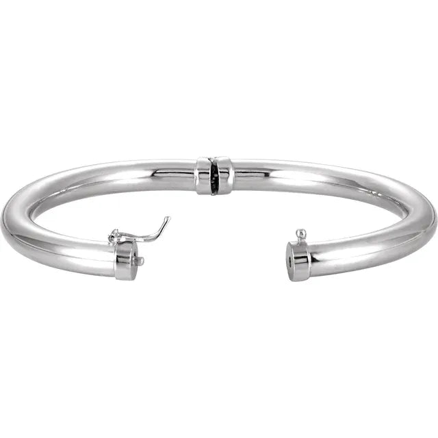 Sleek and understated, this 6mm rounded hinge bangle is a symbol of modern simplicity and refined style. The polished finish gives it a luminous glow, while the rounded shape offers a timeless, minimalist aesthetic that complements any look. Featuring a discreet hinge closure, this bangle provides both ease and security, making it the perfect piece for effortless daily wear.