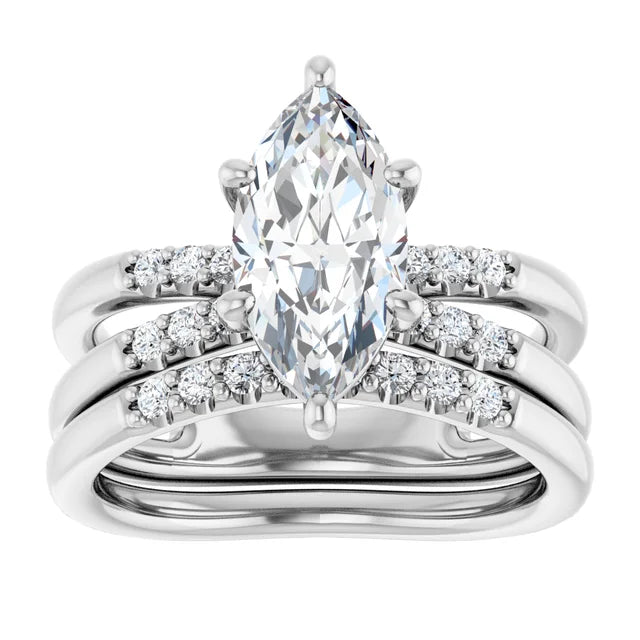 Turn heads with this breathtaking triple band marquise lab diamond engagement ring set, where modern design meets timeless romance. The center holds a 1.5ct marquise cut lab-grown diamond with a symmetrical double-band pavé setting, creating a luxurious layered look.