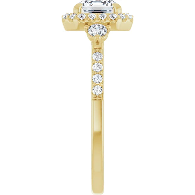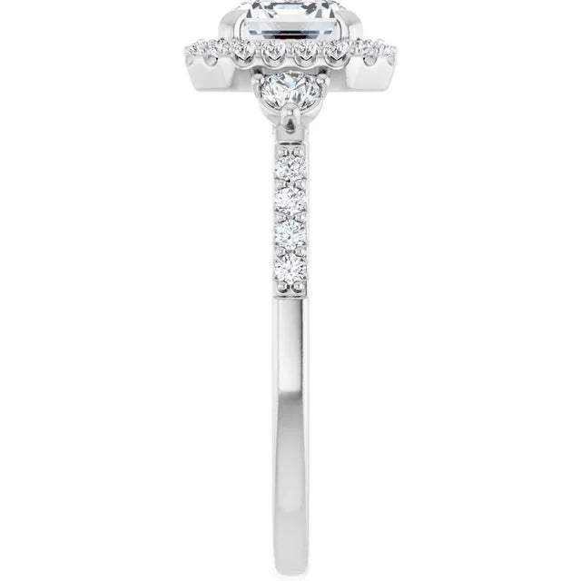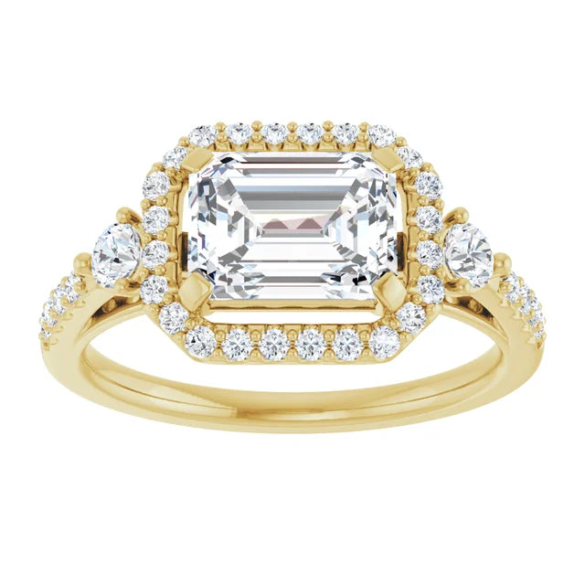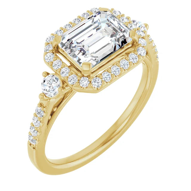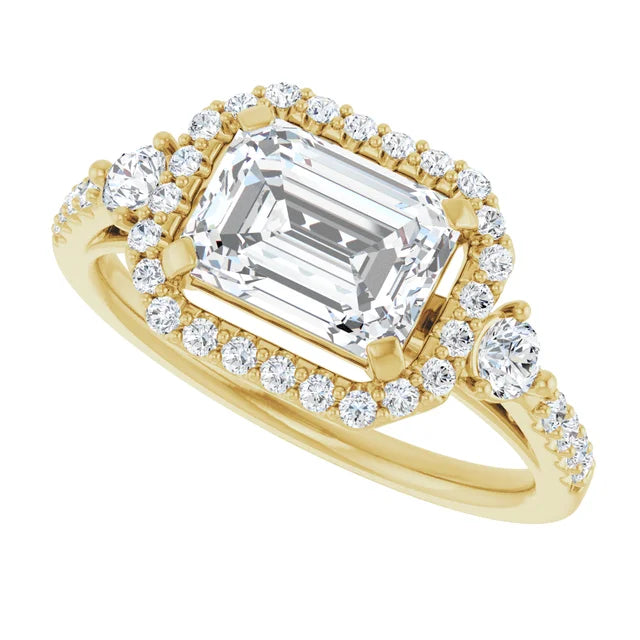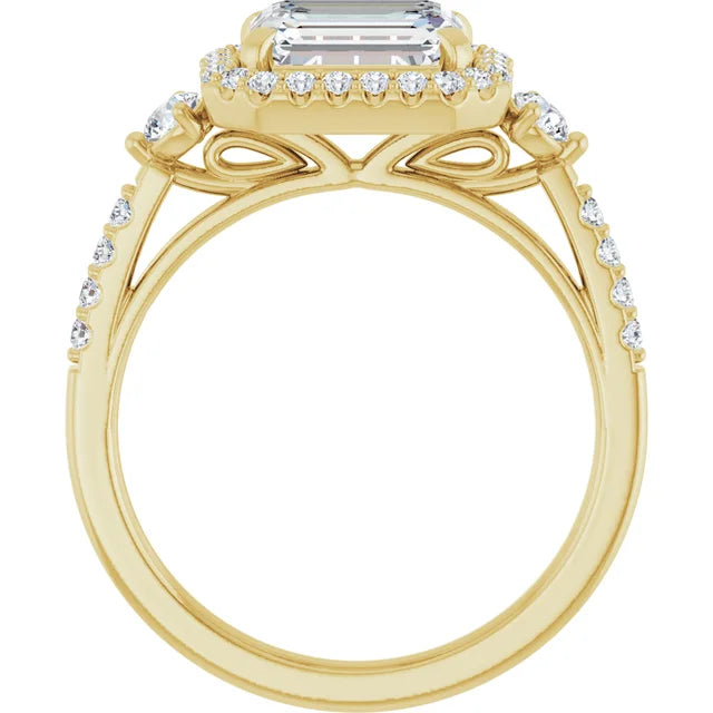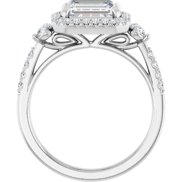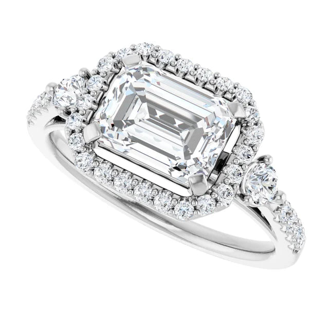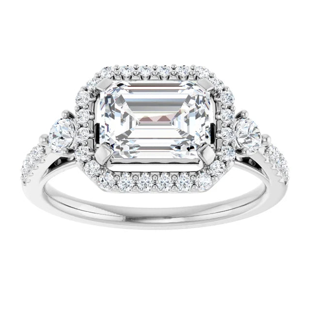 Gracefully bold and endlessly elegant, this emerald-cut moissanite engagement ring is a celebration of timeless design. The radiant center stone is framed in a shimmering halo and flanked by sparkling lab-grown diamonds, delivering a refined yet captivating brilliance from every angle. Hand-set pavé details along the band and a delicately sculpted under-gallery add an extra touch of romance and craftsmanship.