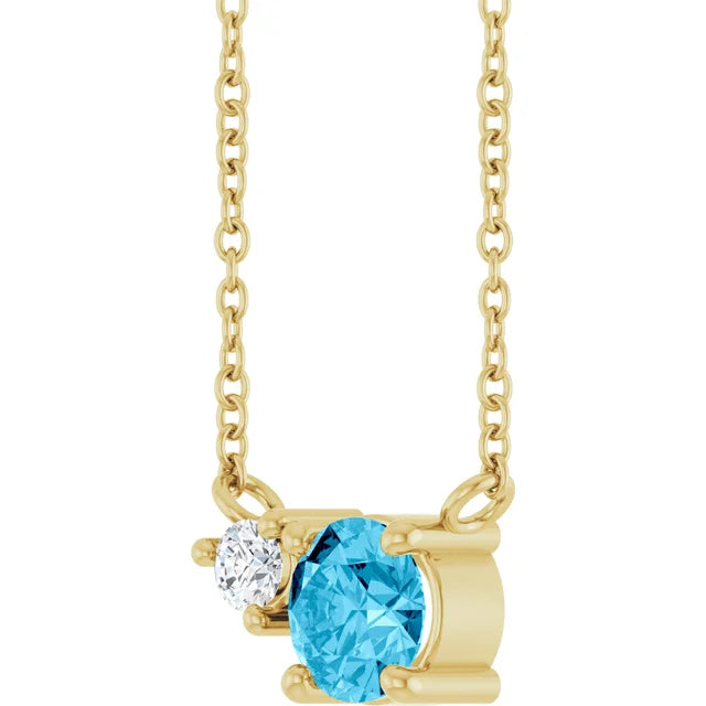 Two Stone Natural Aquamarine & Diamond 14K Solid Gold Necklace