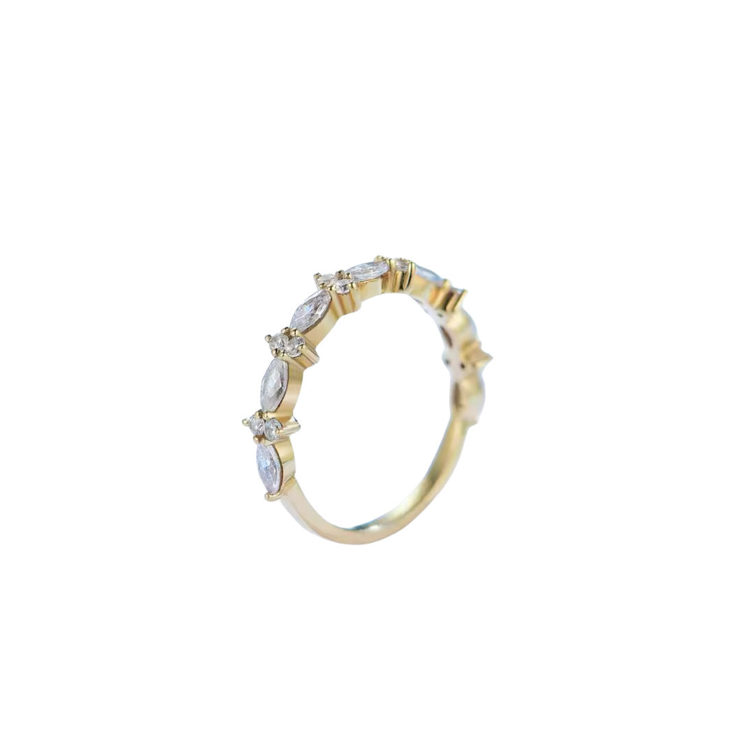 Elevate your elegance with our dainty moissanite diamond band, crafted from solid gold and adorned with exquisite marquise cut stones. This delicate ring features a series of shimmering moissanite diamonds, each expertly cut into graceful marquise shapes that capture and reflect light with captivating brilliance.