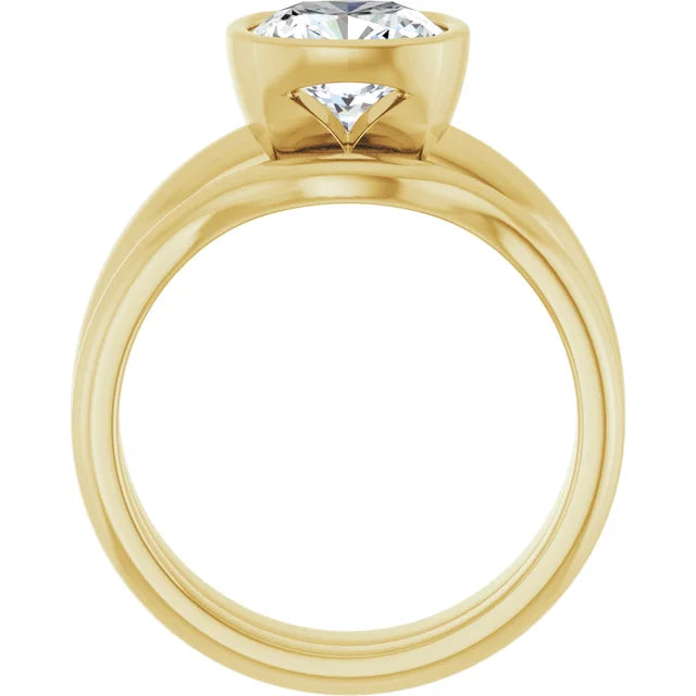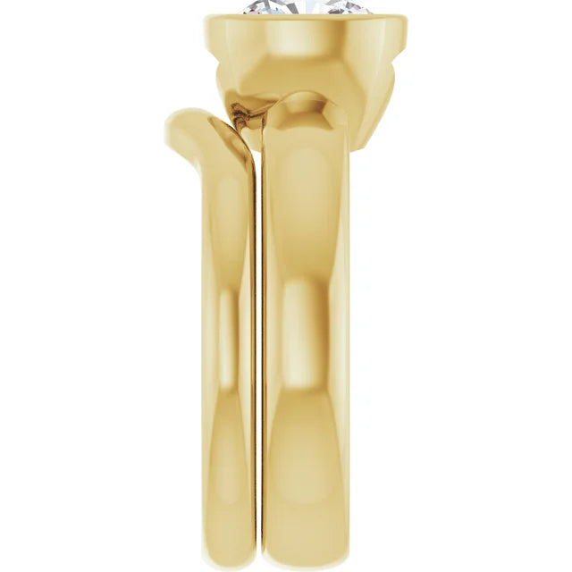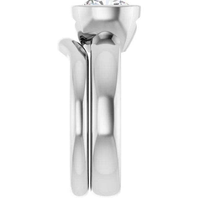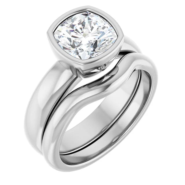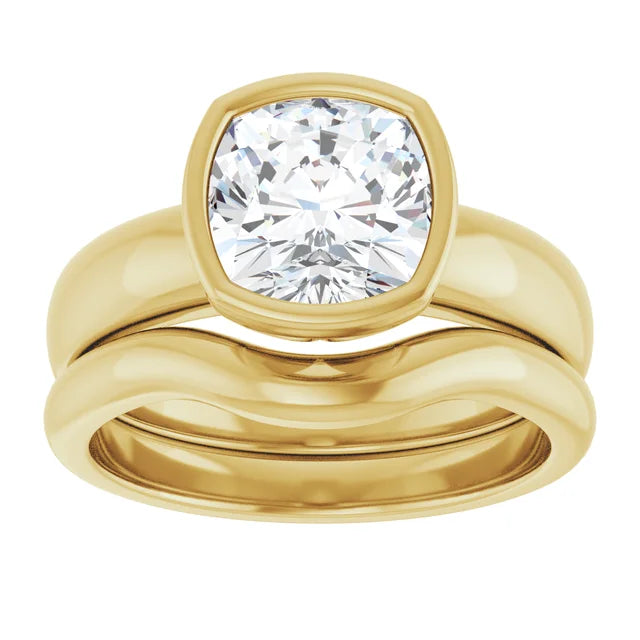 This cushion-cut moissanite ring set is where bold design meets everlasting love. A luminous center stone is in a sleek bezel setting—offering a modern yet timeless silhouette that feels effortlessly elegant. Crafted in your choice of solid 14K or 18K gold or platinum, this piece is made to last a lifetime and beyond.