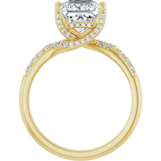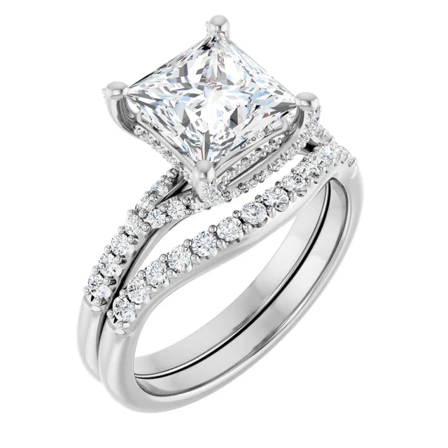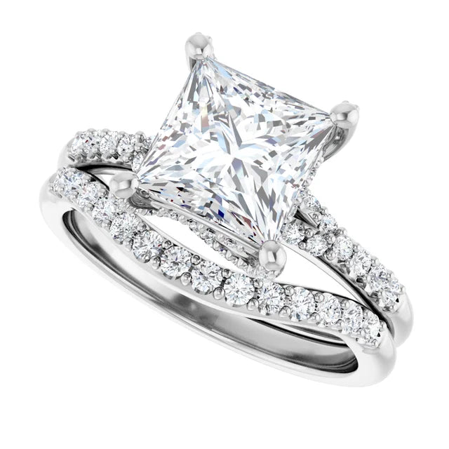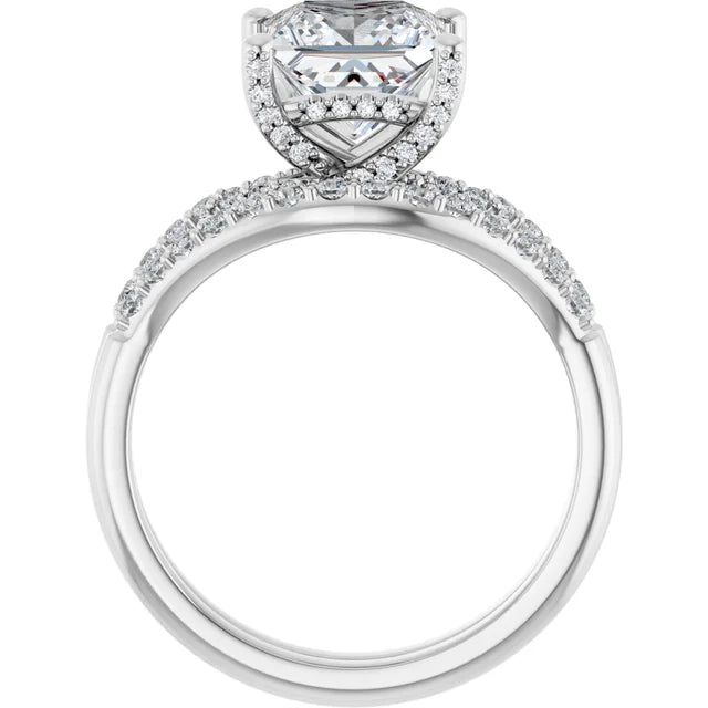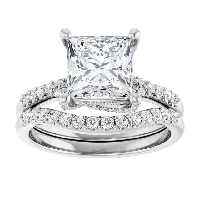 Make a statement with timeless brilliance. This exquisite princess cut moissanite ring is a perfect balance of modern glamour and classic elegance. The bold, square-cut center stone is framed by a refined pavé band, featuring a delicate crossover design beneath the setting—adding a graceful touch of sparkle from every angle.