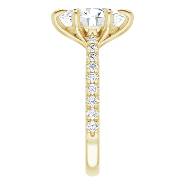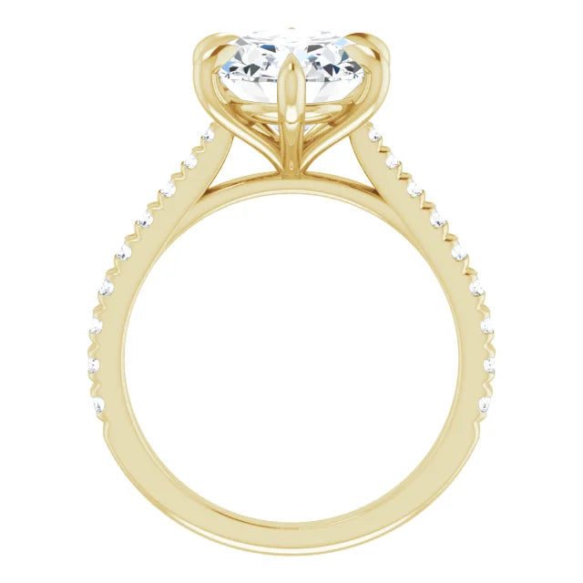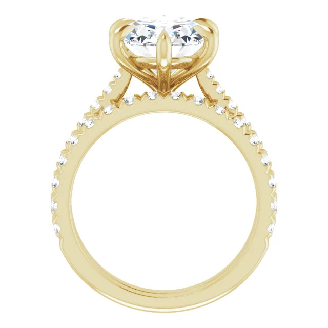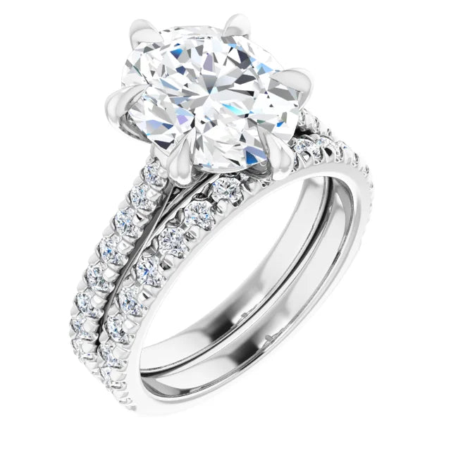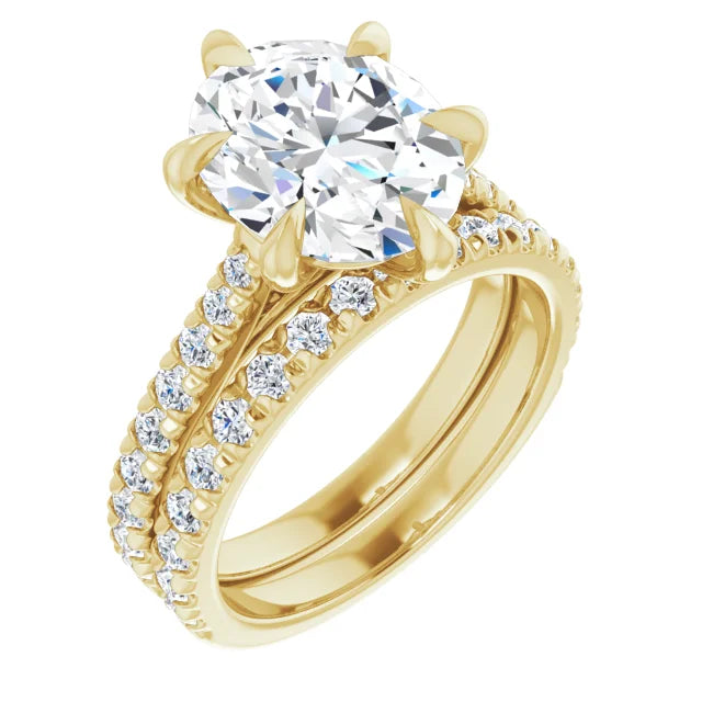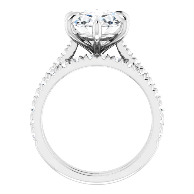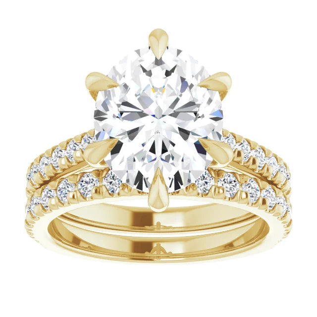 This beautiful oval cut engagement ring features 6 claw prongs to securely hold your center stone. The setting sits high enough for a band to sit comfortably flush with your engagement ring. This ring is available as a ring set or alone and the center stone can be replaced with a diamond upon request.