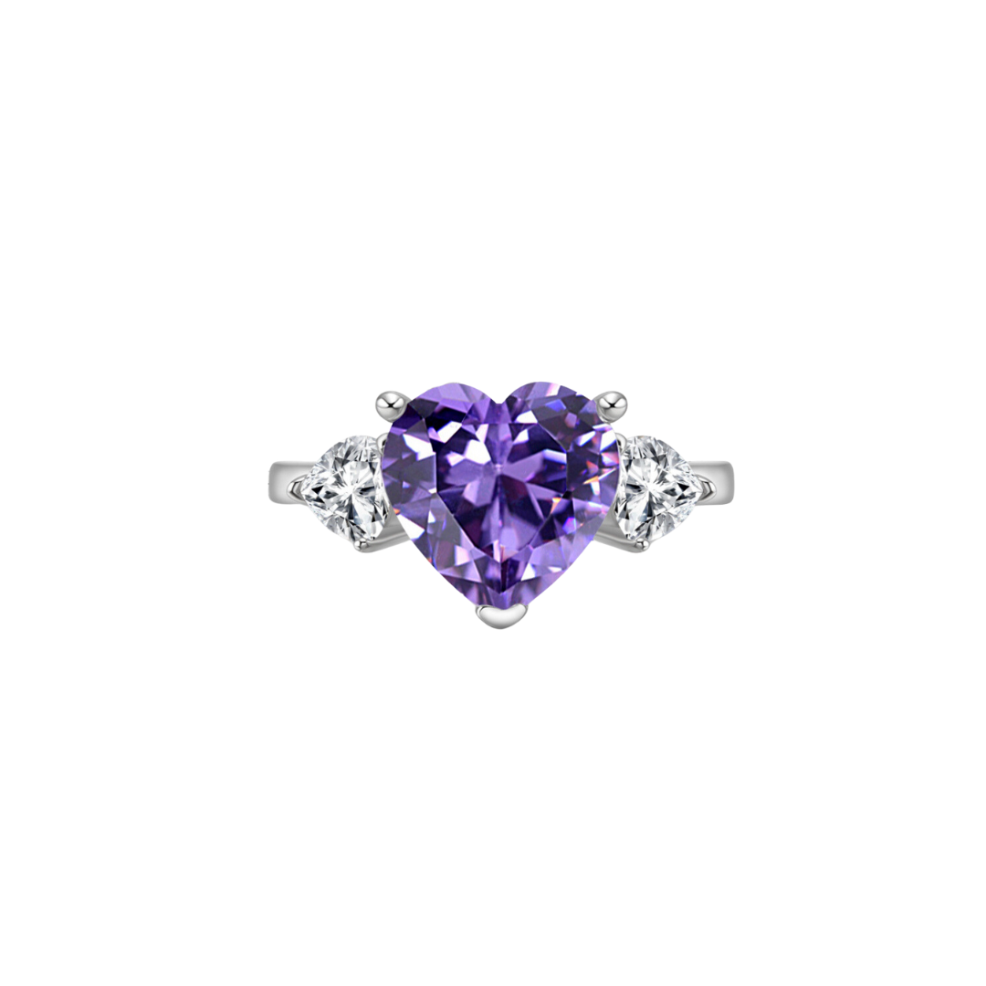 Three Stone Heart Cut Purple CZ Sterling Silver Ring