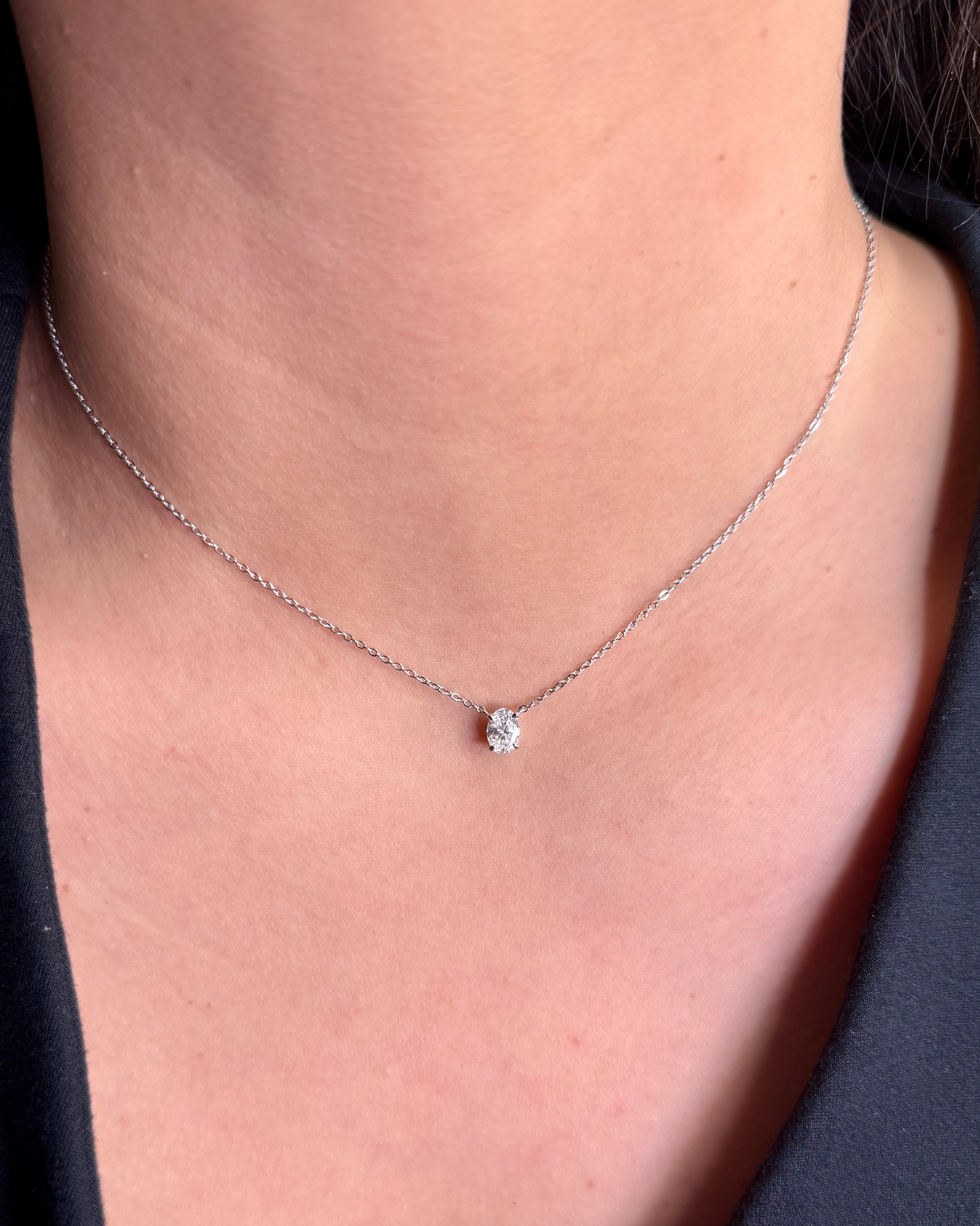 A simple east-west set Moissanite oval cut cable chain necklace makes a the perfect everyday essential.